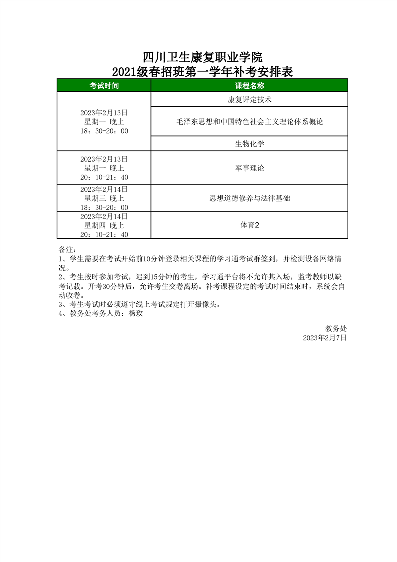2021级春招班第一学年补考安排表