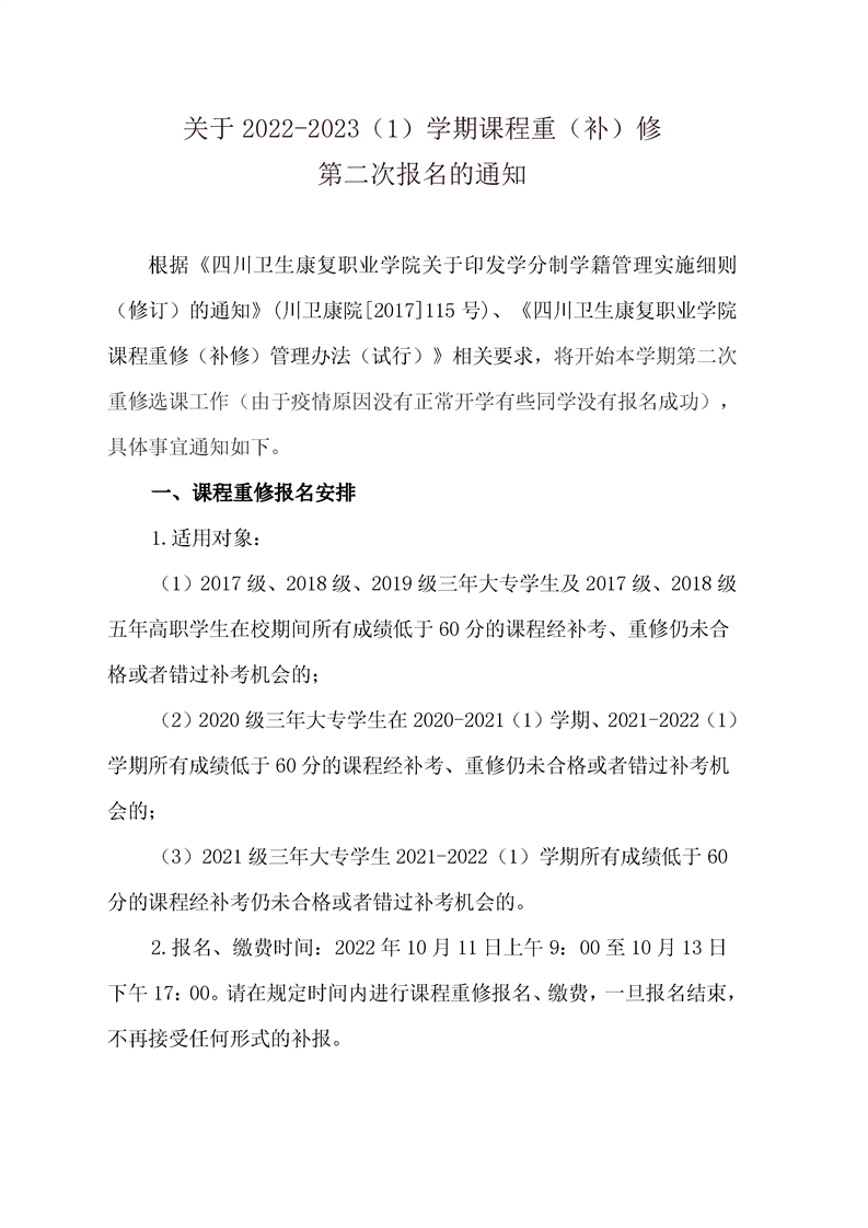 关于2022-2023(1)学期课程重(补)修 第二次报名的通知