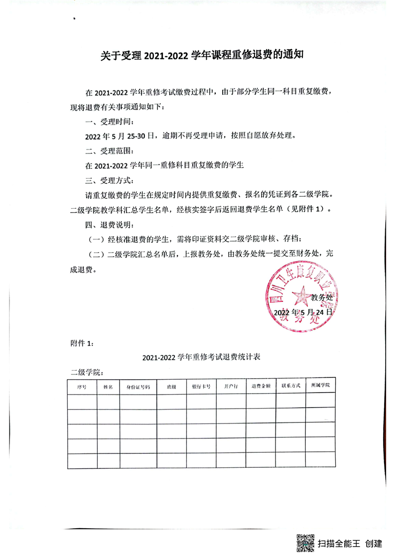 关于受理2021-2022学年课程重修退费的通知