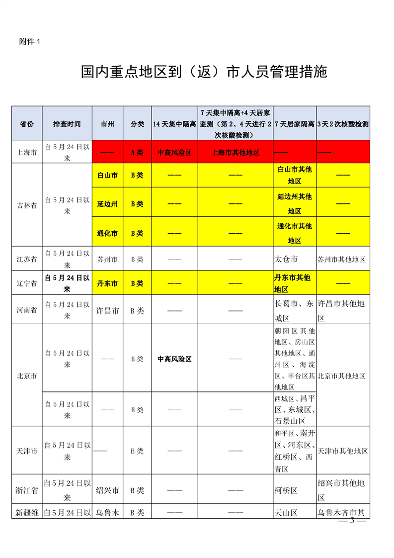 关于国内重点地区名单暨 重点地区到(返)市人员管控措施