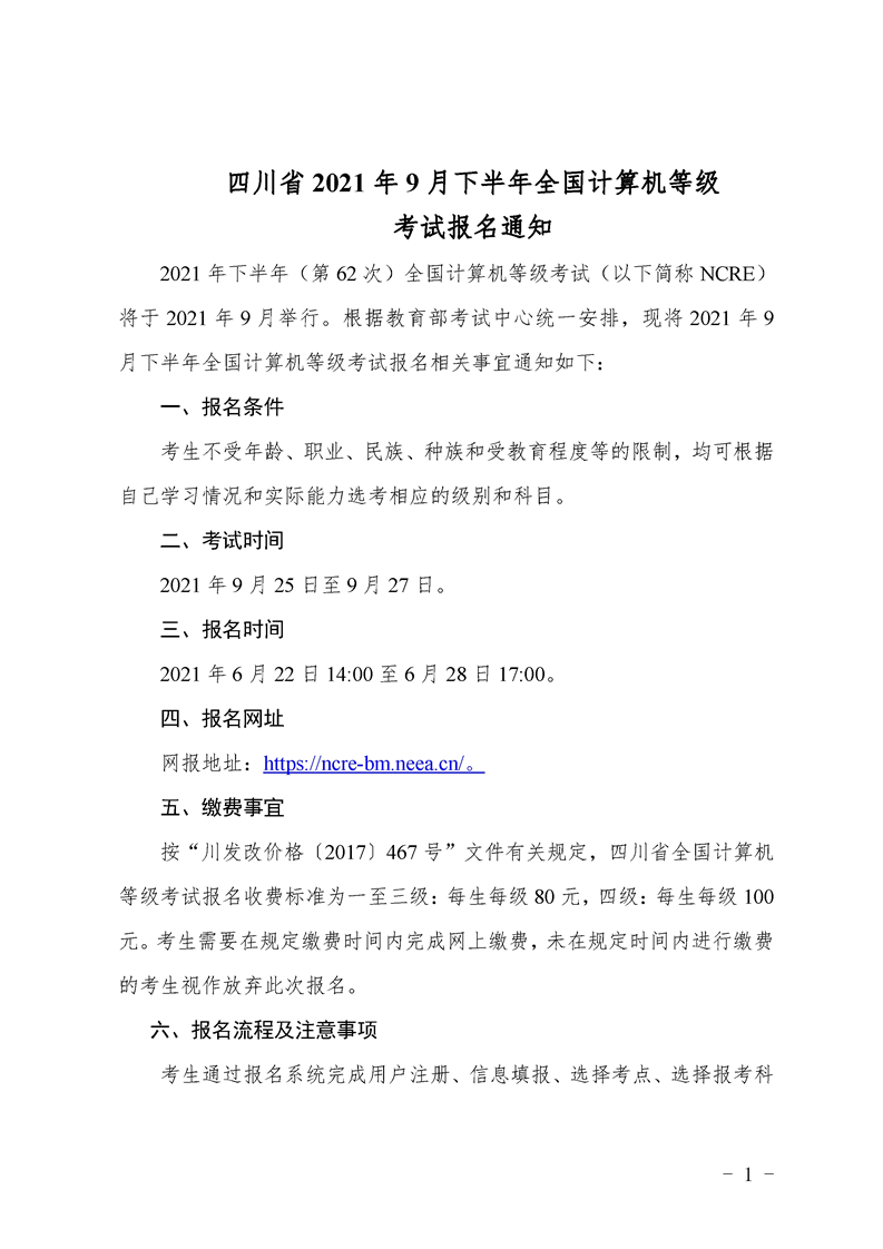 四川省2021年9月下半年全国计算机等级 考试报名通知