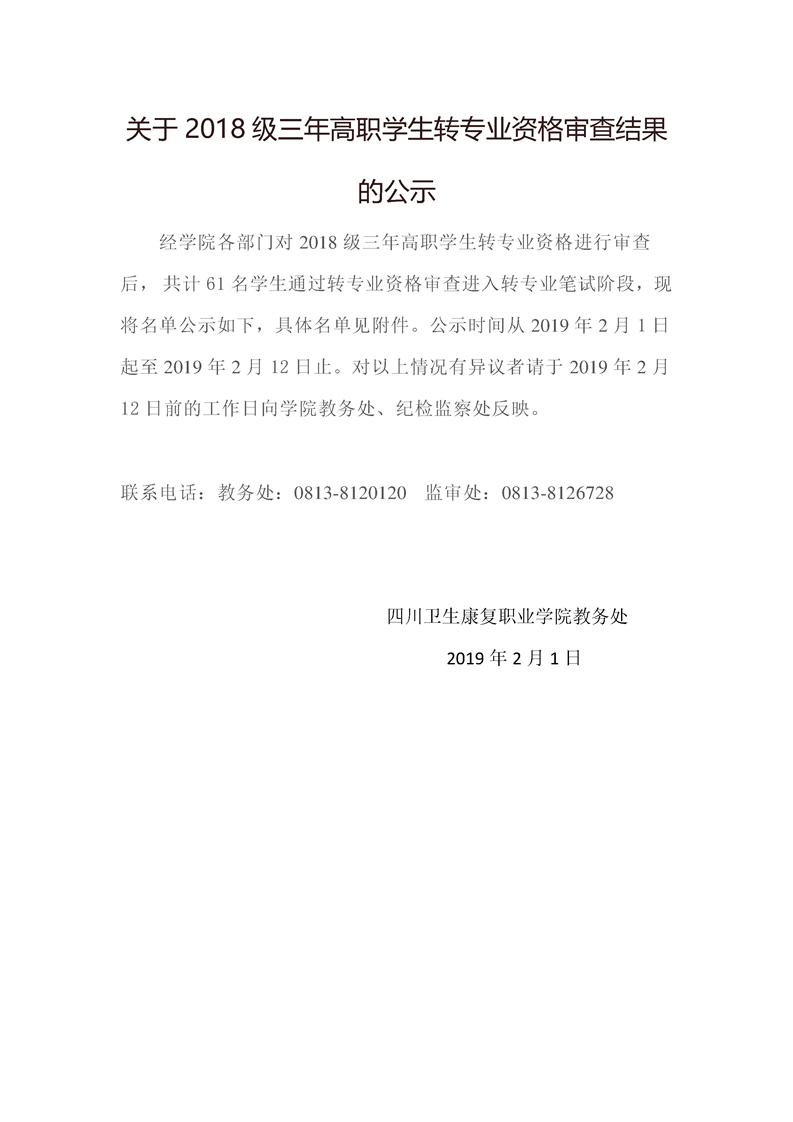 关于2018级三年高职学生转专业资格审查结果的公示