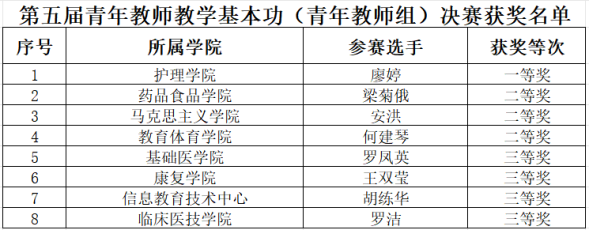 大赛自10月中旬启动以来,各二级学院积极组织选拔,共推荐8名教师参加校级决赛。青年教师组比赛形式采用线上教案和现场教学展示相结合的方式,8位参赛教师以新颖独特的教案设计和现场声情并茂的讲授、丰富多样的形式展示了自己的教学基本功和创新能力。康复学院李勇院长作为主评委从教学内容、教学设计、教学方法、数字化赋能、课程评价等各个环节给予了客观专业的点评,也对如何进一步提升教学给出了中肯的意见和建议。本次比赛经过激烈的角逐,最终评选出一等奖1名,二等奖3名,三等奖4名,获奖名单如下: