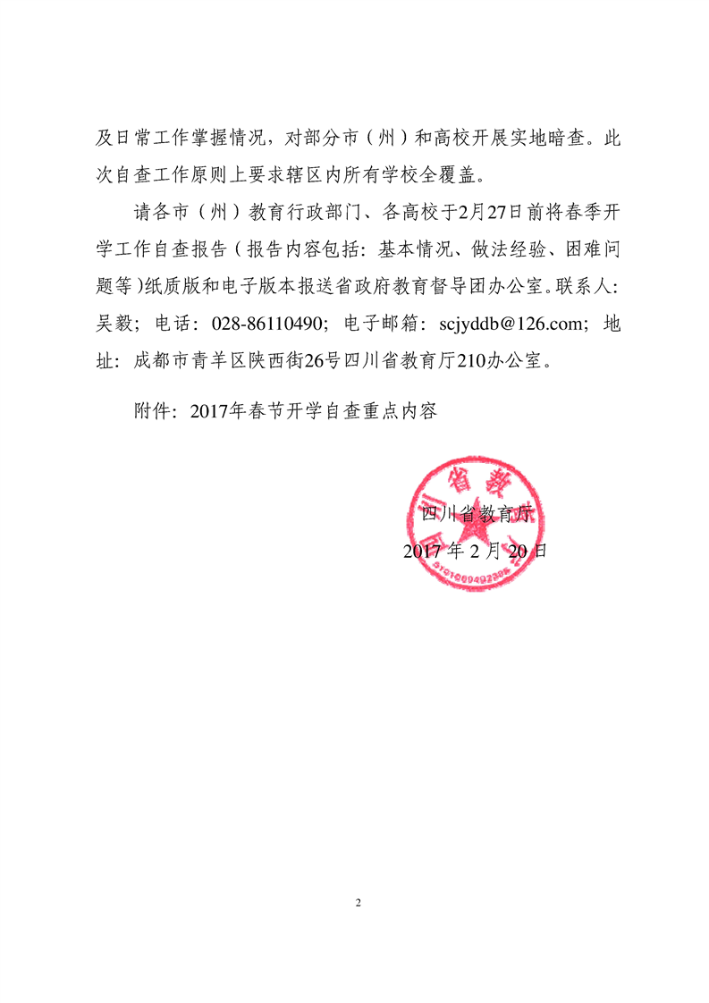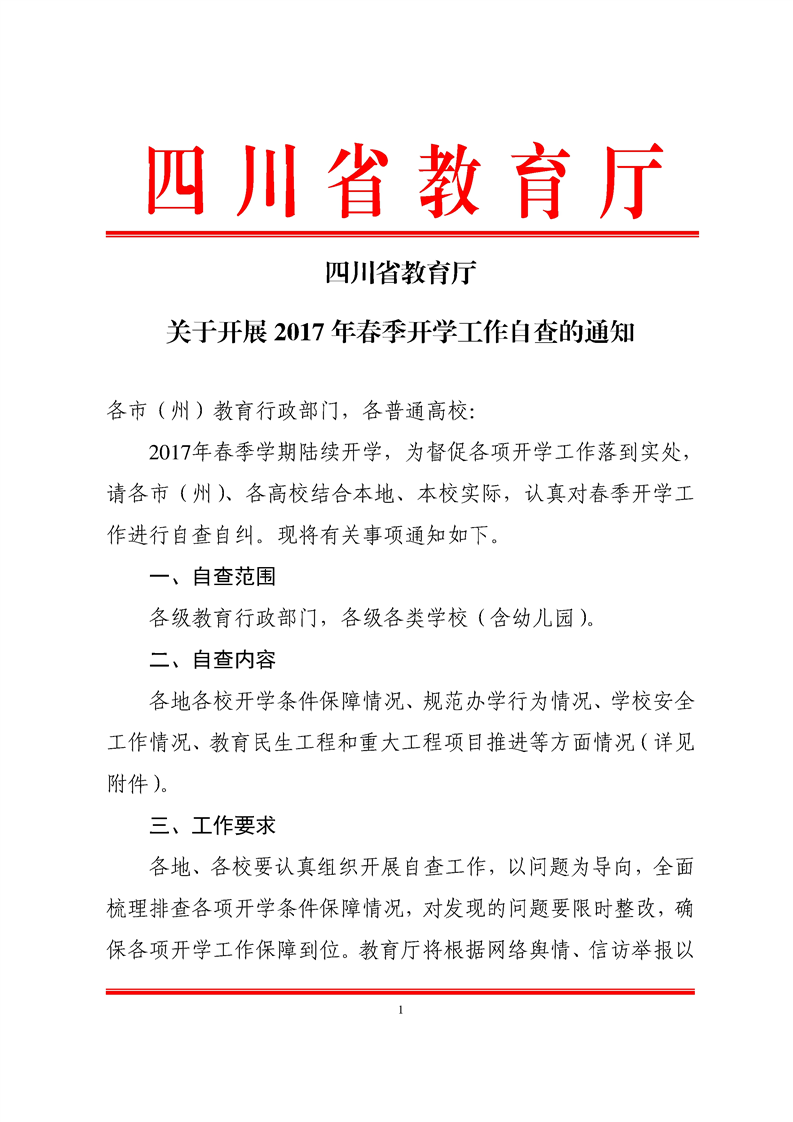 四川省教育厅关于开展2017年春季开学工作自查的通知