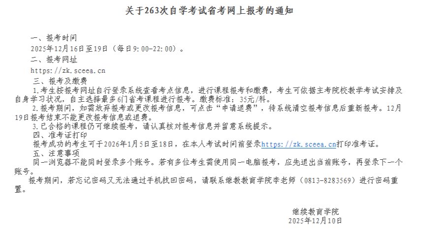 关于263次自学考试省考网上报考的通知 一、报考时间2025年12月16日至19日(每日9:0...
