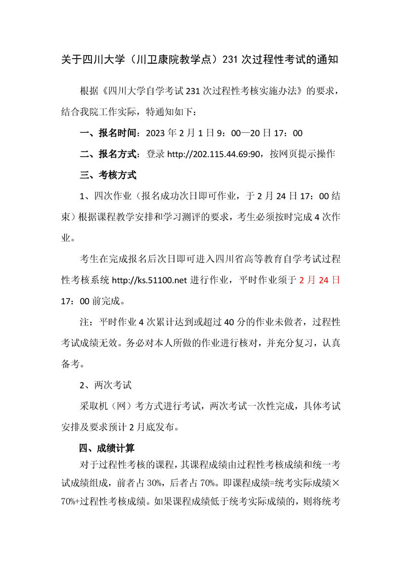 关于四川大学(川卫康院教学点)231次过程性考试的通知