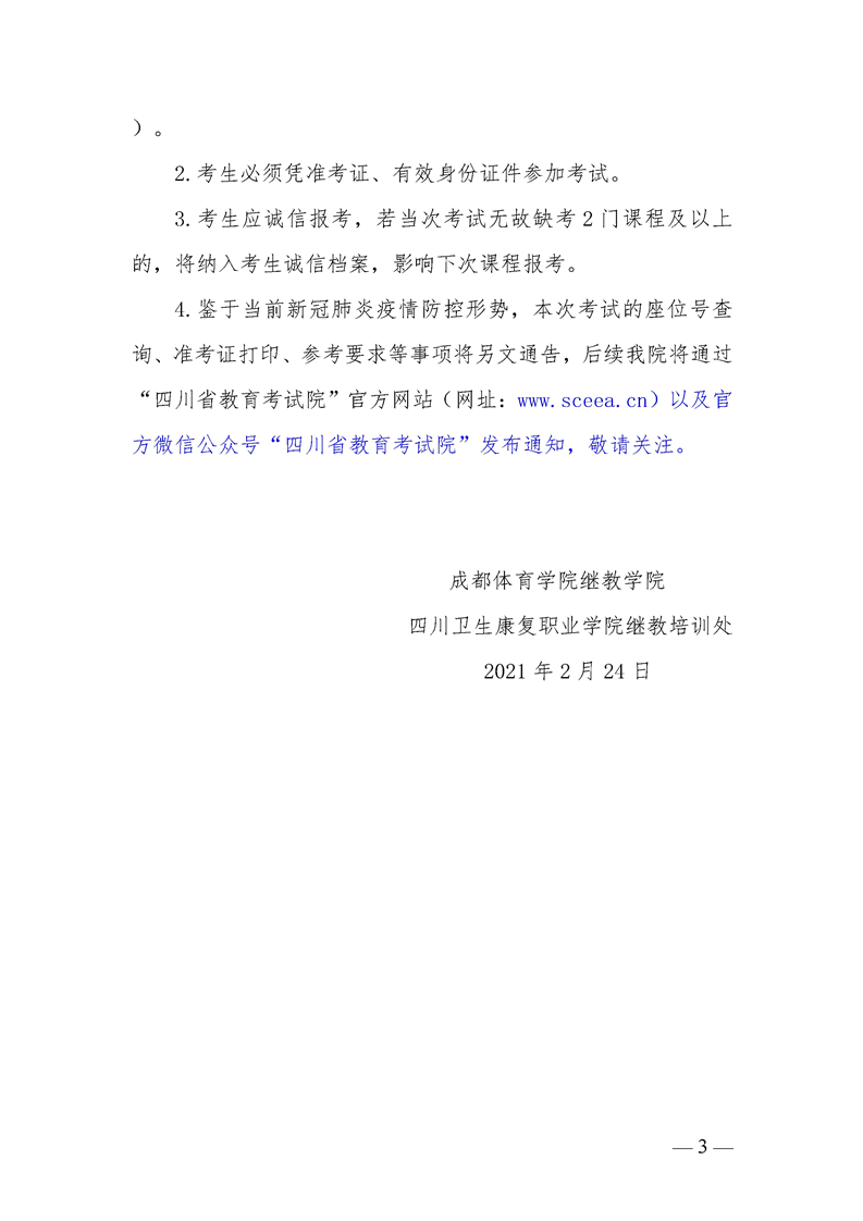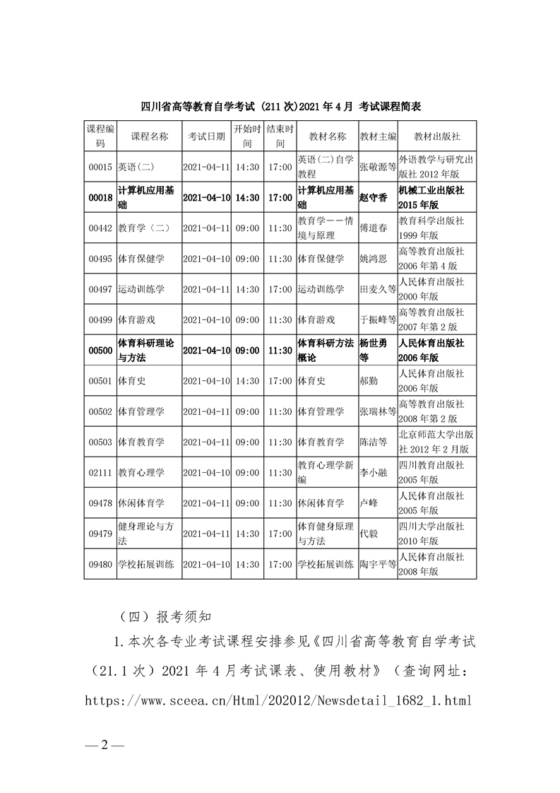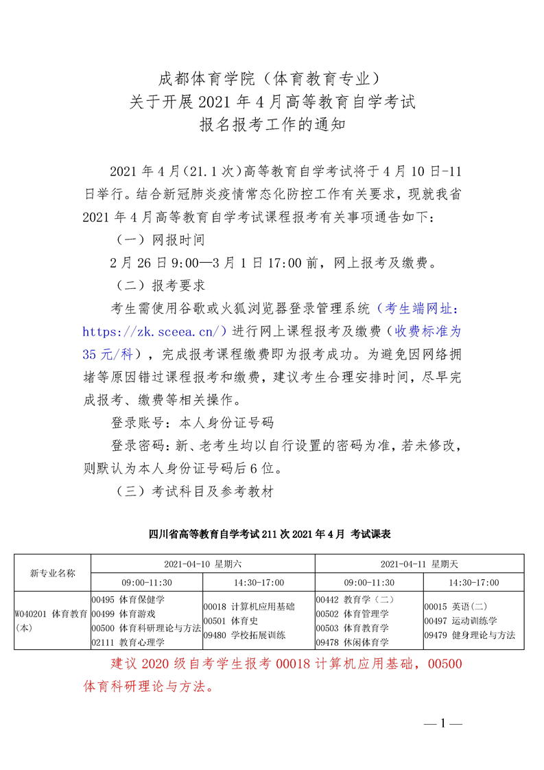 成都体育学院自考2021年4月统考通知