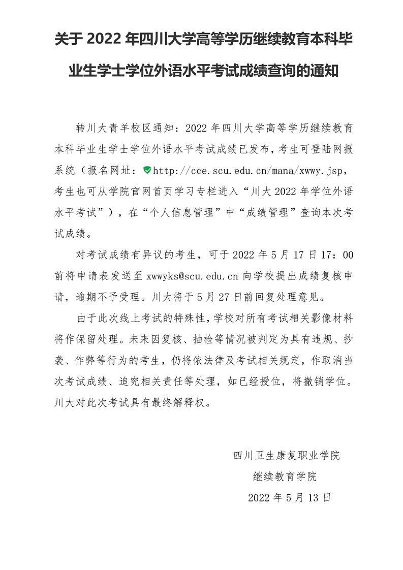 关于2022年四川大学高等学历继续教育本科毕业生学士学位外语水平考试成绩查询的通知