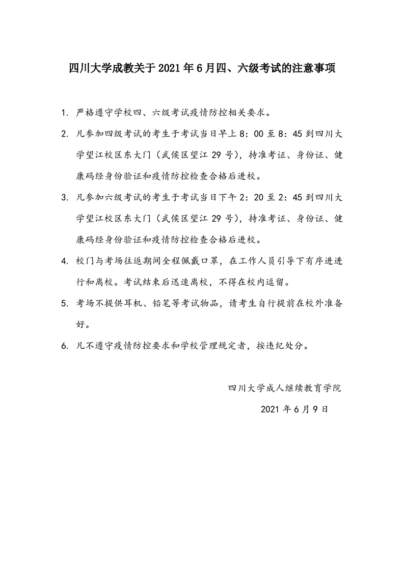 四川大学成教关于2021年6月四、六级考试注意事项