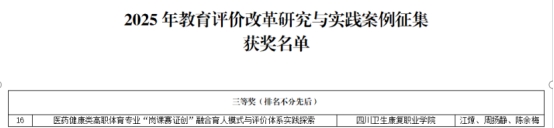 近日,四川省教育评估院公布2025年教育评价改革研究与实践案例获奖名单,taptap点点江燎、周扬静、陈余梅教师团队提交的《医药健康类高职体育专业“岗课赛证创”融合育人模式与评价体系实践探索》案例荣获三等奖。