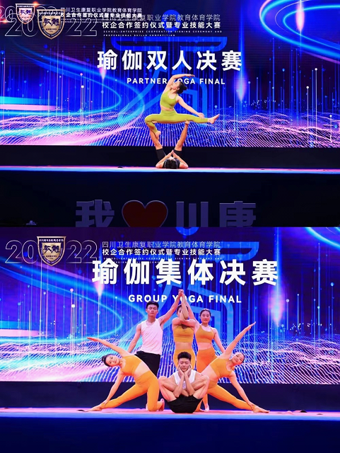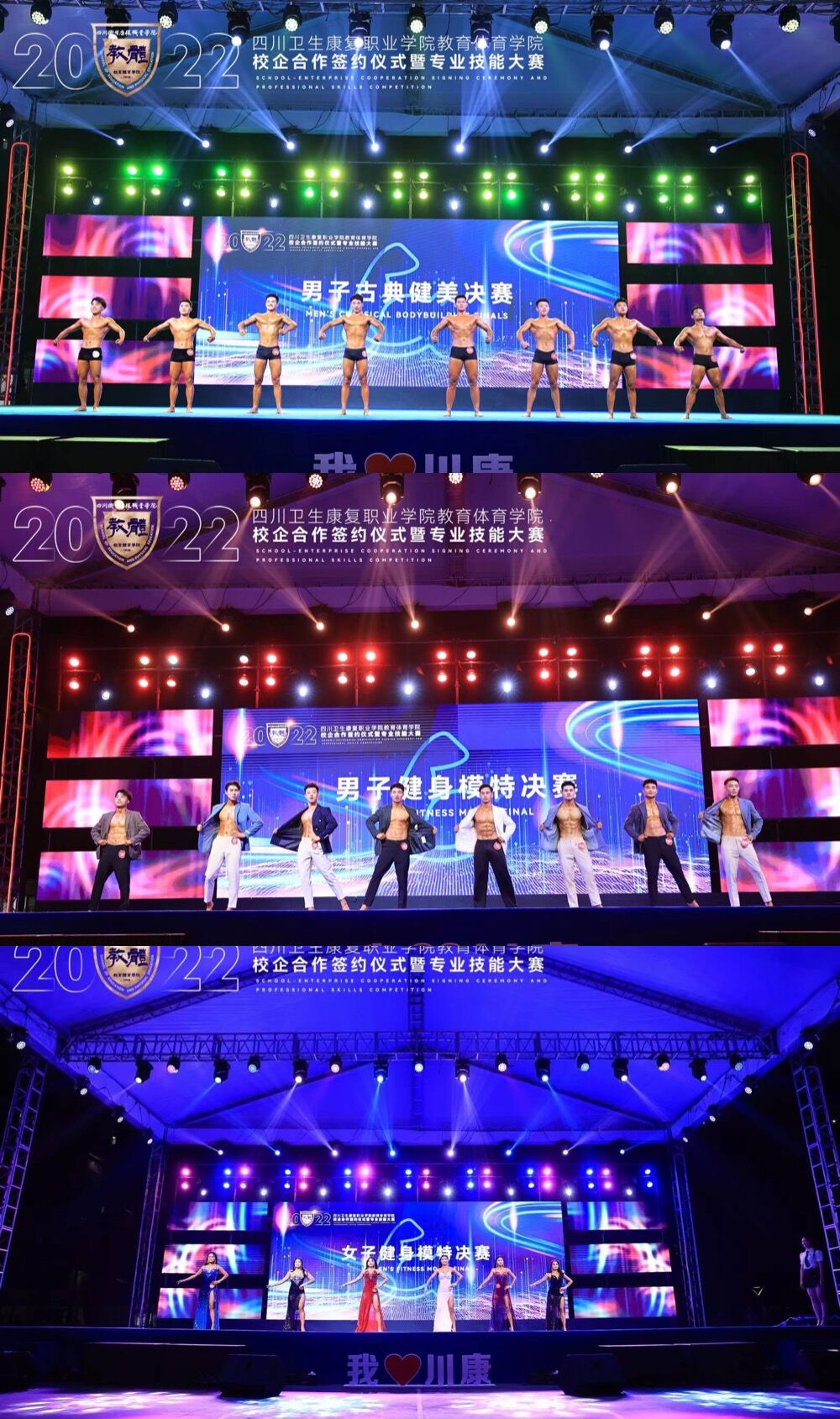 比赛由瑜伽集体组、瑜伽双人组、男子古典健美组、女子健身模特晚礼服组、男子健身模特休闲西服组等五个组别共计50余名运动员依次上台展示,整场比赛精彩纷呈、亮点频出、气氛热烈。在紧张激烈的角逐后,主持人宣布比赛成绩,学院领导和企业代表上台为获奖选手颁奖,合影留念。至此,教育体育学院2022年校企合作签约仪式暨专业技能大赛圆满落幕。