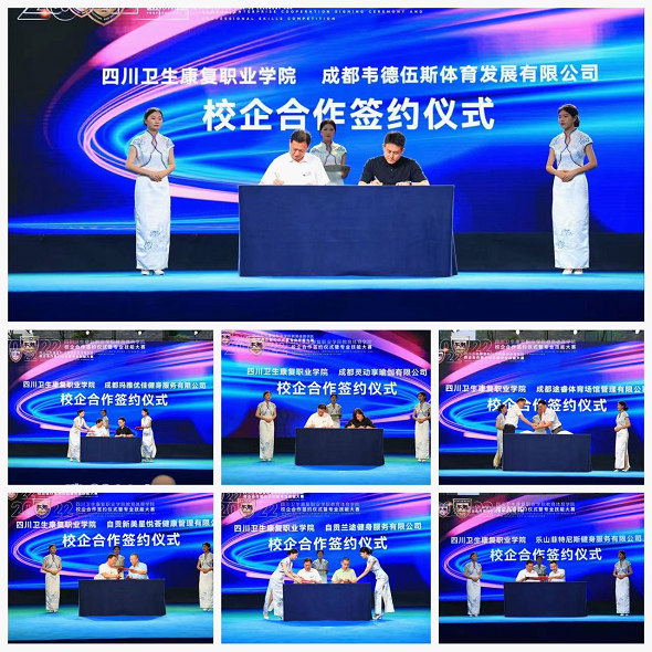 6月15日,为助力学校“双高”建设,进一步深化产教融合,携手企业完善校企合作交流平台,提高学生专业技能水平,教育体育学院隆重举办了2022年校企合作签约仪式暨专业技能大赛。自贡市教育和体育局副局长吴文平,学院院长黄昌平、学院党委副书记李华、学院副院长罗天蔚、学院纪委书记李雁梅,七家校企合作企业代表,学院各职能处室、二级学院负责人以及教体学院全体师生参加本次活动。