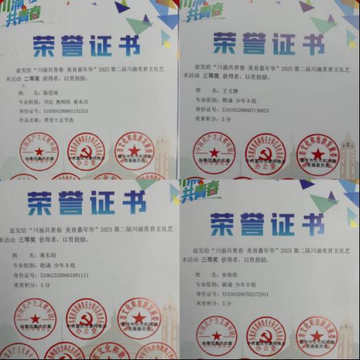 近日,由共青团重庆市委、共青团四川省委等单位主办的“川渝共青春,美育嘉年华”——2025年第二届川渝美育文化艺术活动顺利举办,教育体育学院教师陈思雨在比赛中脱颖而出,荣获教师组基本功书法二等奖。同时,陈思雨老师指导我院24级休闲体育专业学生王文静、蒋东阳,24级健身指导与管理专业学生余俊浩在少年B组朗诵比赛中均荣获三等奖。