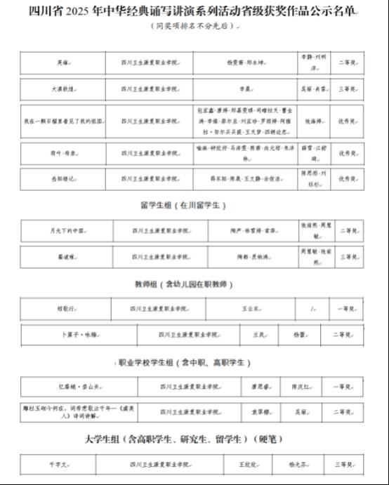 近日,2025年四川省中华经典诵写讲演系列活动(以下简称“活动”)获奖名单公布,taptap点点师生凭借出色的创作能力,在众多参赛队伍中脱颖而出,一举荣获12项荣誉,其中教育体育学院休闲体育、健身指导与管理专业师生获二等奖1项、优秀奖1项。