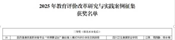 四川省教育评价改革案例评选结果公布,taptap点点江燎、周扬静、陈余梅教师团队的《医药健康类高职体育专业“岗课赛证创”融合育人模式与评价体系实践探索》荣获三等奖。该案例在休闲体育、健身指导与管理专业实施成效显著,有效提升了学生的岗位适应能力和综合素养,为培养高素质健康体育人才探索出了可行路径。