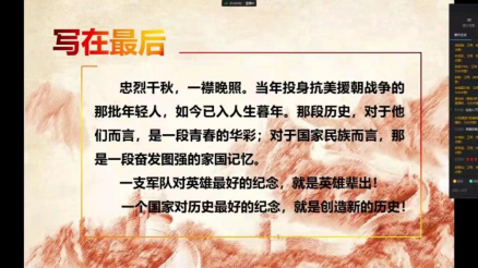 抗美援朝战争,既是从中国的安全出发,又是从拯救朝鲜于危难之际的需要考虑,也是着眼于维护亚洲和世界和平,体现了高度的国际主义精神。我们要传承和发扬抗美援朝精神,雄赳赳、气昂昂,向着实现中华民族伟大复兴的中国梦奋勇前进。2022年11月4日党建促进会举办了以“光影镌刻历史,回溯抗美援朝”为主题的线上精品党课活动。康复学院支部委员卫琛为大家授课。
