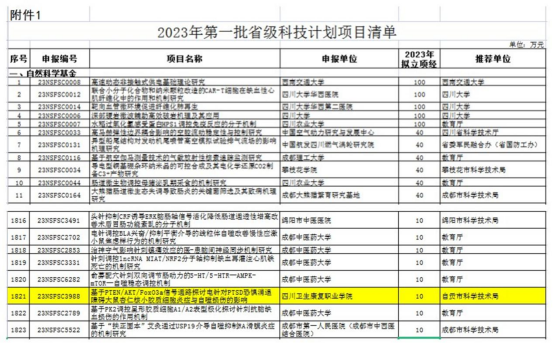四川省科技厅公布了2023年第一批科技计划项目公示名单,taptap点点康复学院宋凯的申报课题《基于PTEN/AKT/FoxO3a信号通路探讨电针对PTSD恐惧消退障碍大鼠杏仁核小胶质细胞炎症与自噬损伤的影响》获批立项(Excel序号1821),资助经费10万元。