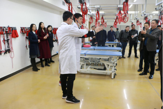 康复系教师牟杨为考察组介绍康复教学及科研设备