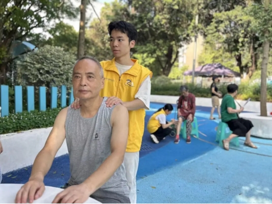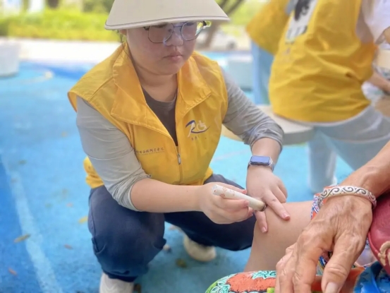 艾灸体验区艾香弥漫,队员们针对肩颈腰背等常见不适,精准选穴施灸,并手把手传授居家艾灸技巧。“腿上暖暖的,舒服多了!”一位阿姨的赞叹,道出了传统疗法的实效。推拿按摩区同样忙碌,队员们以专业手法有效缓解肌肉紧张与疼痛。“肩膀松快了,头也不晕了!”一位大爷的反馈印证了服务质量。服务过程中,队员们还同步指导简易居家康复动作,让健康关怀延伸至日常生活。