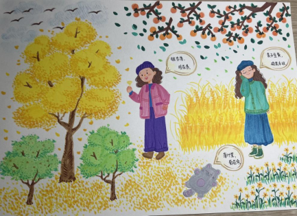 作品简介:这幅作品以童趣画风展现秋日盛景,银杏金黄、桂香浮动,麦田丰收、菊花竞放,人物与萌宠在斑斓秋意里,共赏丰收与诗意的季节之美。