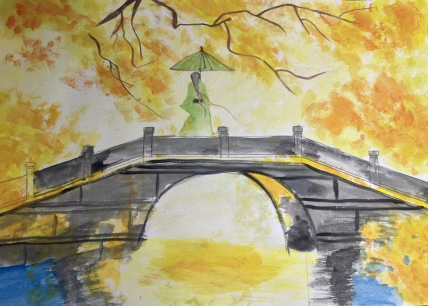 作品简介:这幅水彩作品以秋日为基调,描绘了古桥畔的诗意场景。金黄的树叶渲染出浓郁秋意,身着绿衣、手持油纸伞的女子漫步桥边,古桥的灰调与秋色的暖黄形成对比,尽显古典雅致的东方韵味,传递出静谧悠远的秋日情思。