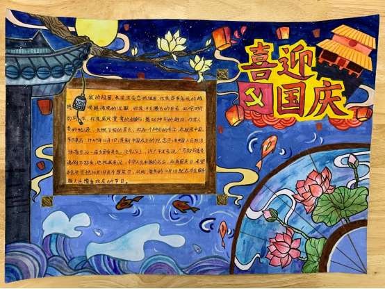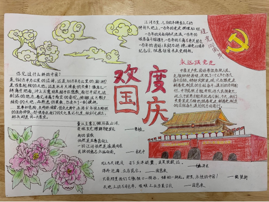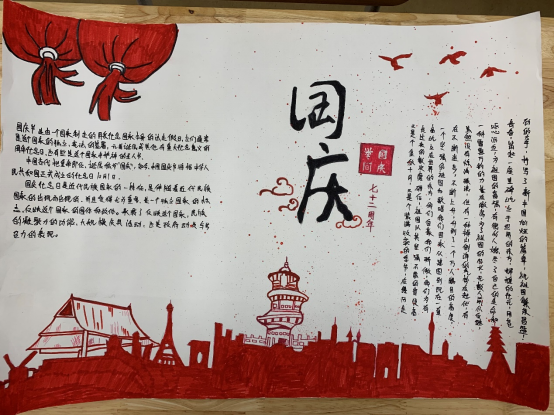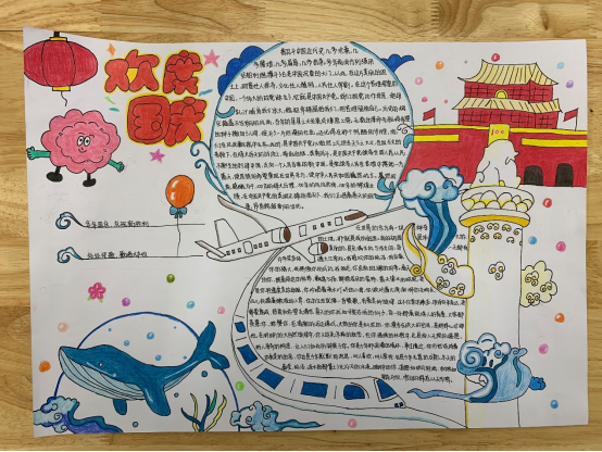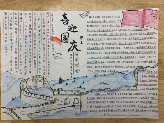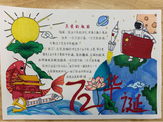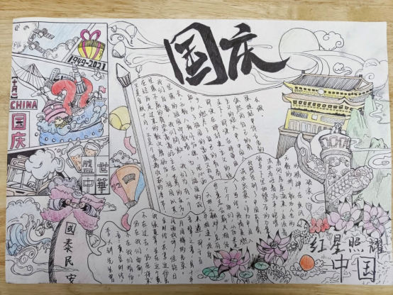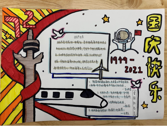 春生夏长,秋收冬藏,又来到了一年一度的金秋十月,为迎接和庆祝祖国第72个生日,新媒体中心于2021年9月28日举办以“色彩晕染、欢度国庆”为主题的手抄报比赛在taptap点点康复系如火如茶地展开。今天让我们共同从绘画中吸取养分以唤起那红色的记忆,鲜艳的五星红旗、雄伟的天安门、飞向四方的和平鸽、巍峨的万里长城,深深印在每一位中华儿女的心中。他们用画笔表达着对祖国深深的爱意,他们热爱美丽的祖国,也必将在祖国强大、幸福的怀抱中茁壮成长!