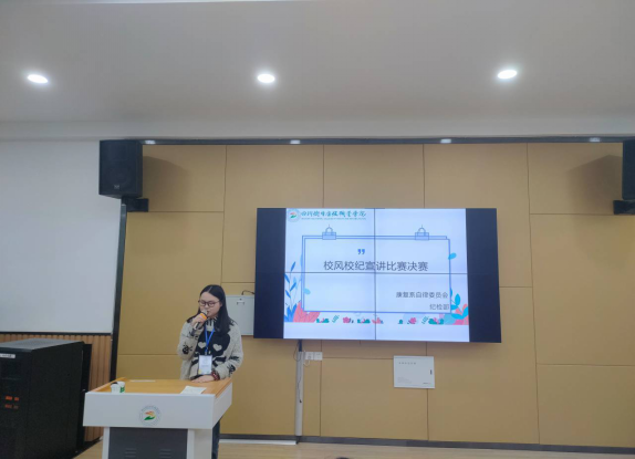 为积极响应学校号召,增强学生思想道德素养,努力把学生培养成遵纪守规的社会主义的合格的建设者和接班人,确保形成安全、有序、文明、和谐的校园环境。康复系自律委员会纪检部于2020年11月18日14:00举办的“校风校纪”演讲宣传活动决赛在4教D401开展,参与人员有康复系各部门负责人,以及100名观众。