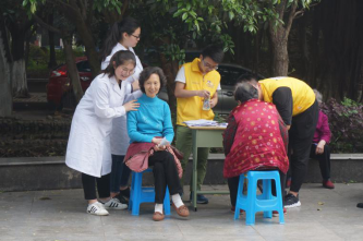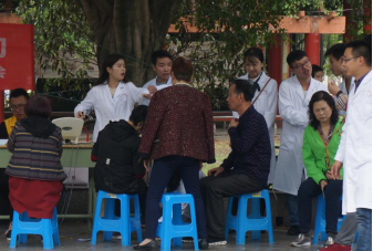 来自康复系的大白和小黄人正在为社区居民进行健康档案登记、手法康复、电磁、中频和气罐治疗。
