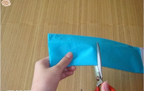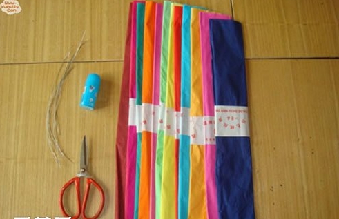 第二步:把皱纹纸叠起来,剪出12根长度32厘米的纸线条。