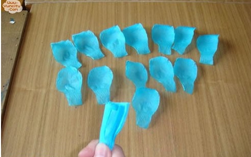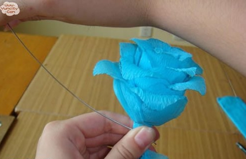 第五步:将花瓣分开,先用刚刚剪花瓣剩下的皱纹纸做出花蕊,包好花瓣即可。
