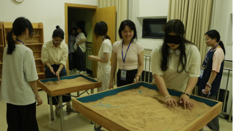 活动伊始,主持人将同学随机分组,随后进入趣味十足的游戏环节。在“你画我猜”游戏中,画者与猜者密切配合,现场气氛异常活跃;“沙海寻秘”环节中,参与者蒙眼触摸沙具,小组成员通过讨论共同分析答案,极大地增强了团队成员间相互协作能力;“无声传递”则考验成员的沟通能力,这些游戏逐渐打破了同学们之间的陌生感与隔阂,充分展现了团队的合作与凝聚力。