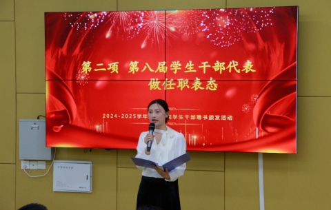 以责任为先、协作为本、创新为要,共同开创学生组织新局面。第八届学生干部代表文林钰进行了就职发言,她并表示将以"三个坚持"开创工作新局面:坚持文化传承与制度创新双轮驱动、坚持服务宗旨与部门建设深度融合、坚持团队成长与组织发展同频共振。她铿锵有力的表态引发全场热烈掌声,展现出新生代骨干的魄力与决心。