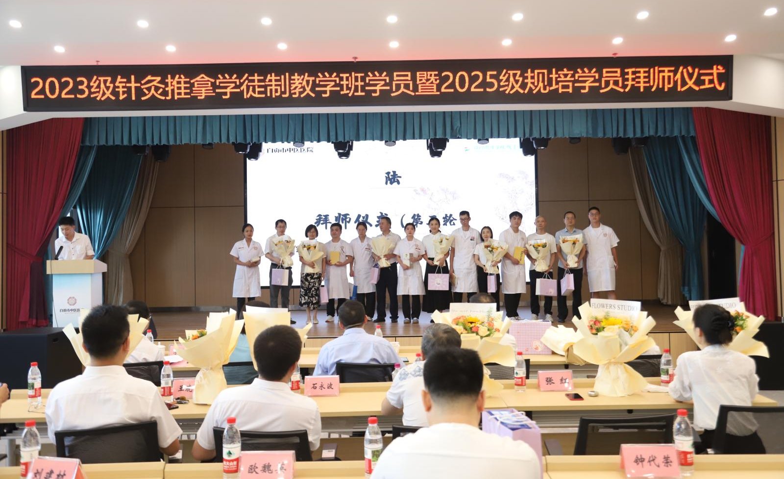 随后举行核心环节——传统拜师礼。2023级针灸推拿学徒制班学员庄重地走到各自的师承老师面前,满怀敬意地向老师献上鲜花,表达对导师的敬仰和求学的诚心。导师们则郑重地向学员回赠专业书籍,寓意着知识的传承和对弟子的殷切期望。这一献花与赠书的仪式,庄重而温馨,生动诠释了尊师重道的传统美德和薪火相传的师承精神。
