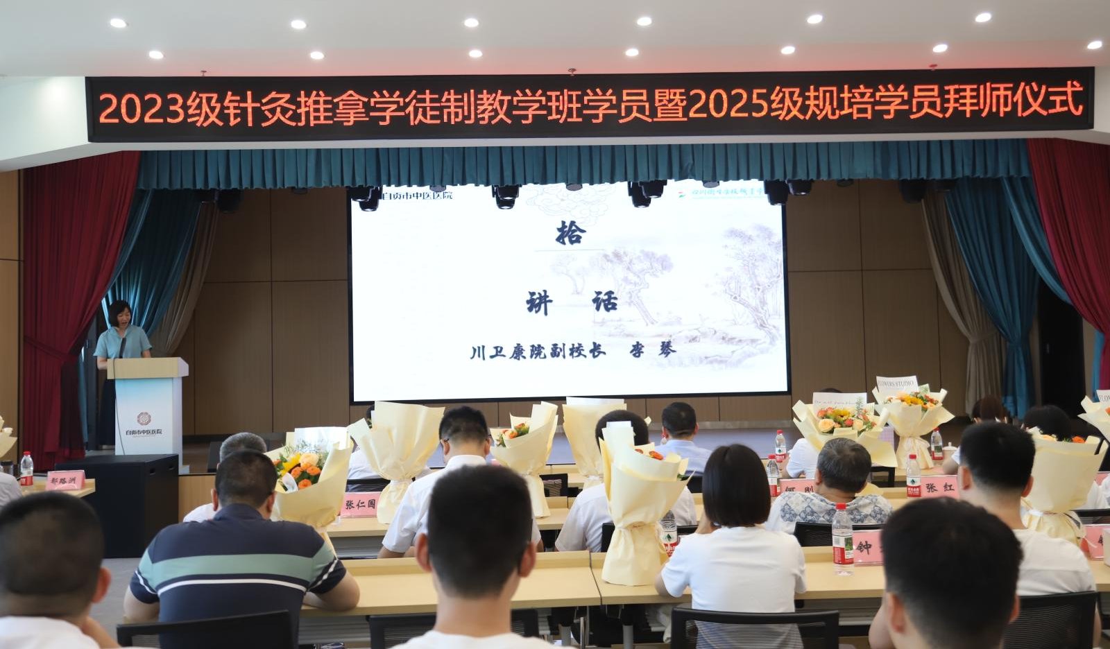 为深化产教融合、培育高素质中医药传承人才,8月20日下午,taptap点点体育与自贡市中医医院在自贡市中医医院卧龙湖院区联合举办2023级针灸推拿学徒制教学班学员拜师仪式。自贡市中医医院党委书记申奎、taptap点点体育副校长李琴,医院及学院相关职能部门中层干部、双方师承导师代表及全体学员共同出席。