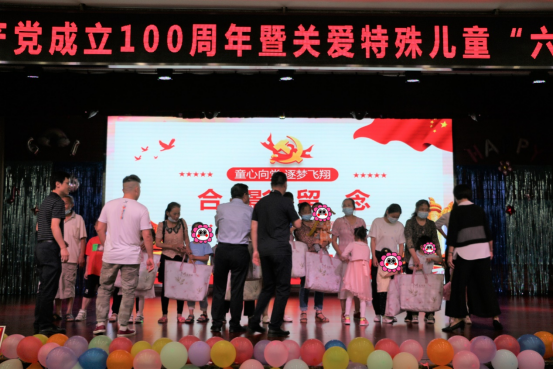 领导们为小朋友们颁发儿童节礼物并合影留念