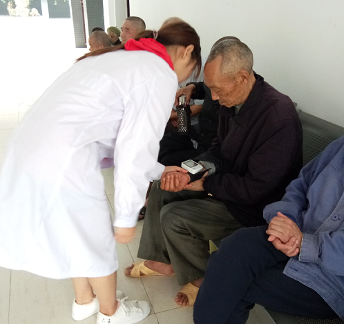 (同学为老人提供血压测量服务)