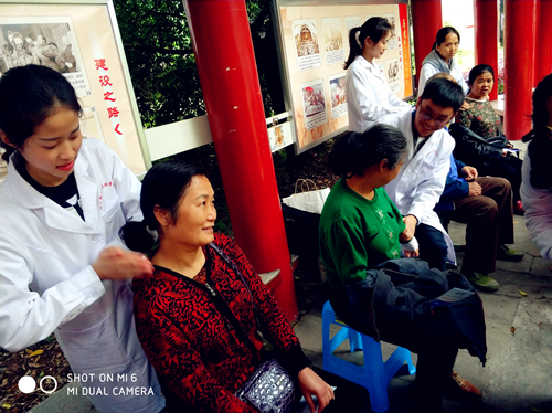 首先叶陈老师为居民们普及了骨性关节炎疾病的诊治及防护相关的知识,居民受益匪浅,纷纷向老师提出自己的问题,叶陈老师耐心地回答了每一个问题并且嘱咐居民们爱惜自己的身体。同学们有序不紊的开始了义诊活动,幸福的笑脸洋溢在每一个人的脸上,满足的情感飘扬在明珠社区的每一个角落。