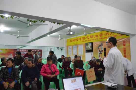 图为李威老师为社区老人做膝关节炎防治的讲解