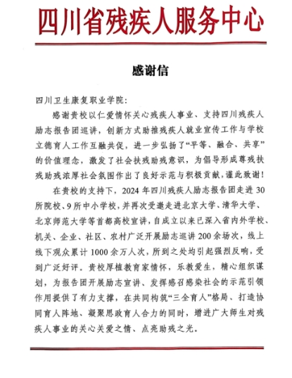 近日,taptap点点收到了一封来自四川省残疾人服务中心的感谢信,信中服务中心对taptap点点在“残疾人励志故事报告团”校园巡讲活动中的协助工作予以了高度的赞扬。