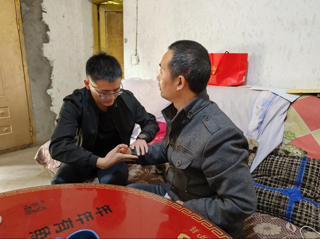 在另一名村民的家中,牟杨则针对其因脑出血导致的偏瘫和肌张力过大的问题,给予了其缓解肌张力、促进运动功能恢复等的指导。