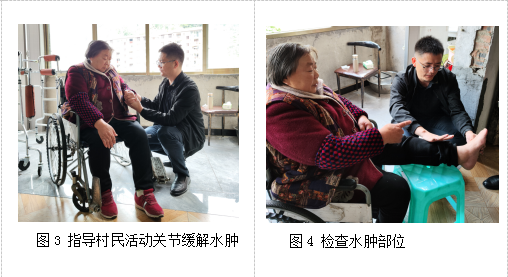 在走访慰问村重点人群时,得知两名村民有强烈的康复需求,便随即前往村民家中探访。针对其中一名因脑卒中导致右侧偏瘫的村民,牟杨耐心地对其居家牵伸、恢复关节活动等进行指导,给予患者和家属居家康复措施建议。