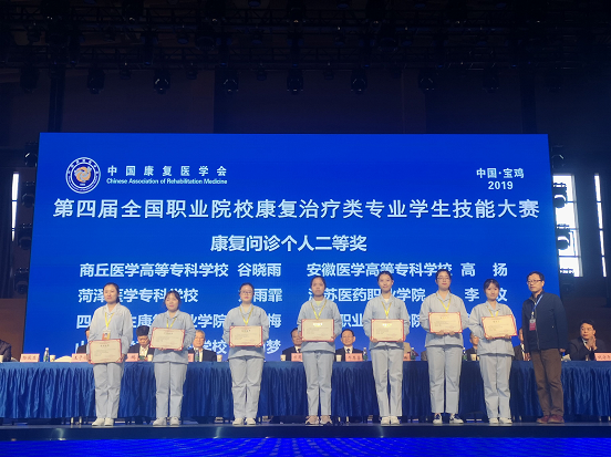 由中国康复医学会康复教育专业委员会、全国卫生职业教育教学指导委员会康复治疗类专委会主办的第四届全国职业院校康复治疗类专业学生技能大赛,于2019年10月27日在陕西省宝鸡市宝鸡职业技术学院举行,本次大赛共有来自全国21省的71支参赛队伍,271名参赛选手,同台竞技。本次大赛包括理论知识和技能操作两部分。我院学生以优异成绩连续四届斩获康复治疗类专业学生技能大赛团体一等奖,并获个人奖6项,其中“康复治疗单项”奖1项、“理论竞赛单项”奖3项,“康复问诊单项”奖1项,“康复评定单项”奖1项。