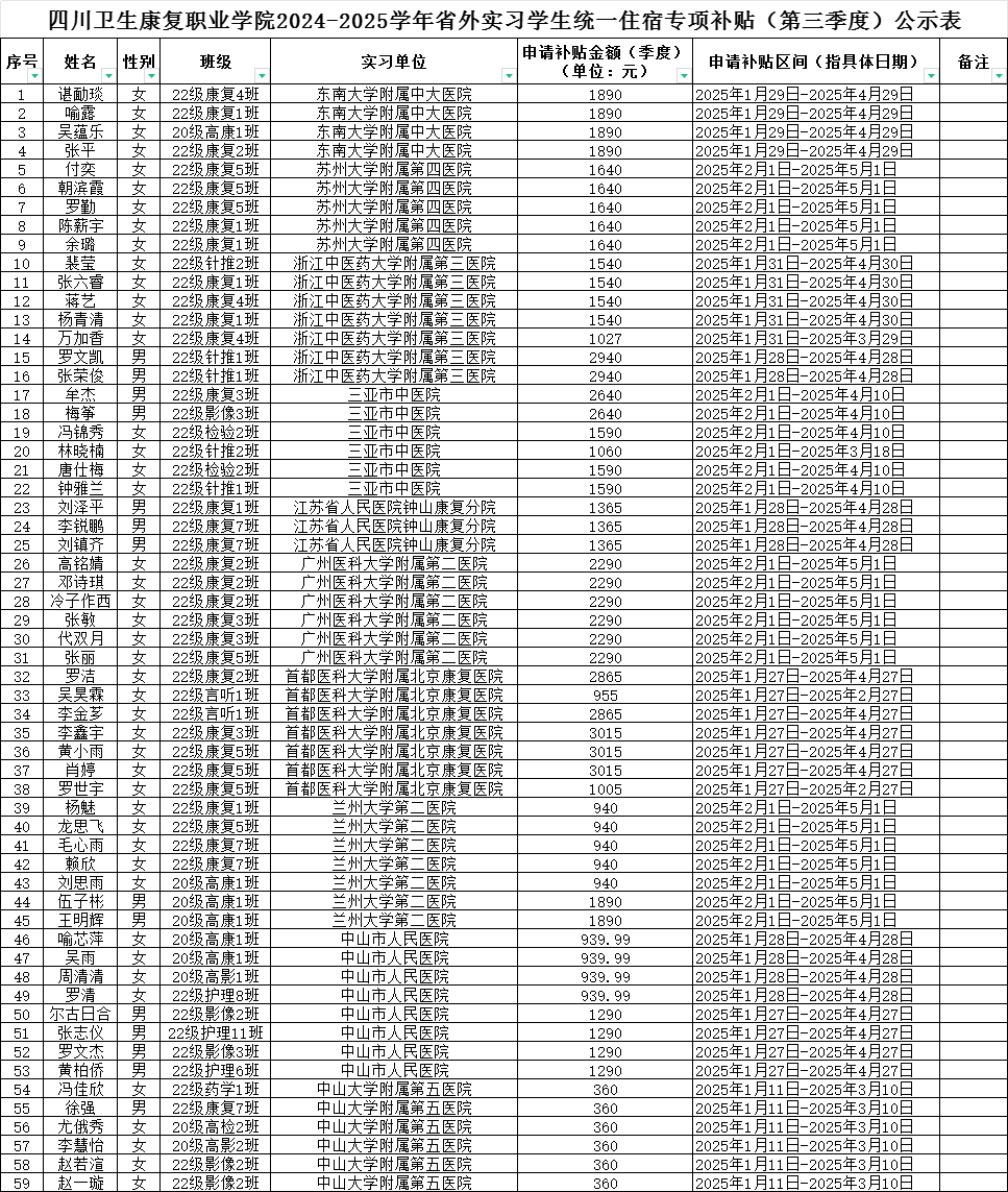 根据学院《2024-2025学年省外实习学生统一住宿专项补贴方案》,现将2024-2025学年省外实习学生统一住宿专项补贴(第三季度)情况公示如下(详见附件),公示时间为2025年3月31日至4月4日。