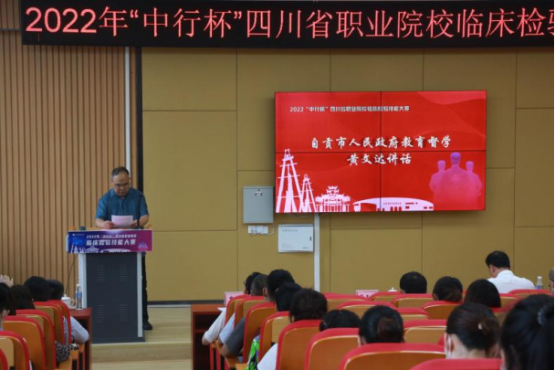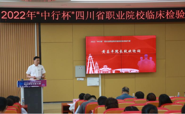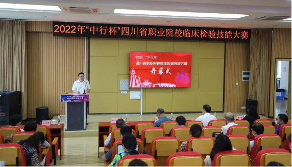 开幕式由学院副院长申奎主持,院长黄昌平代表学院全体师生向各位领导、专家、评委,各兄弟院校带队老师、参赛选手的到来致以热烈欢迎,并表示学院将竭诚为大赛的顺利进行保驾护航;自贡市政府教育督学黄文达发表讲话,勉励各参赛院校在比赛过程中发扬“技能成才,强国有我”的工匠精神;四川省临床检验中心主任蒋黎宣布大赛开幕。