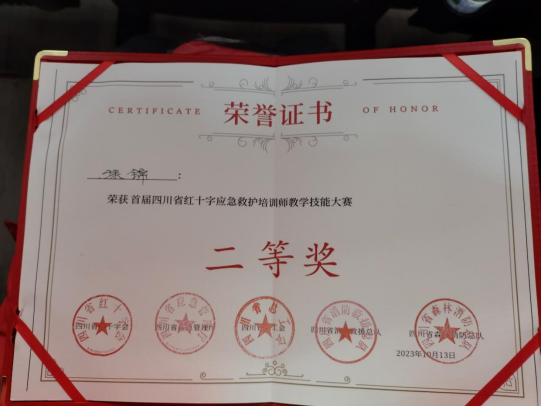 taptap点点临床医技学院教师徐锦,作为自贡市应急救护优秀师资,代表自贡红十字会亮相赛场。通过急救护理论教学(说课)和实操教学两个环节的激烈角逐荣获二等奖,并在颁奖仪式中,受邀上台再次进行说课风采展示,系全场唯一。