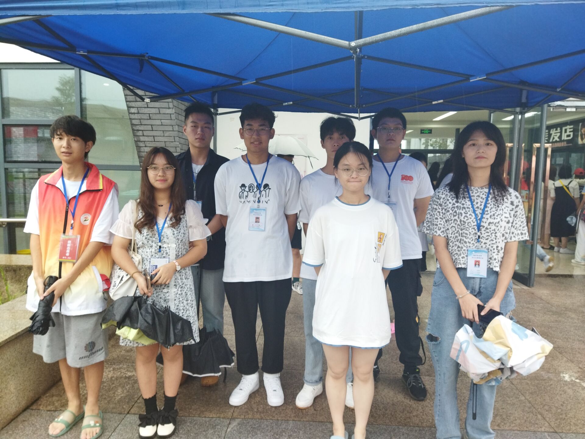 志愿者们有的冒着风雨在校门口等待新生,有的在报到点指引新生登记,有的反复在雨水中穿梭送新生到寝室,还有的在寝室楼里上下穿行帮助搬运行李。志愿者们,你们是好样的!