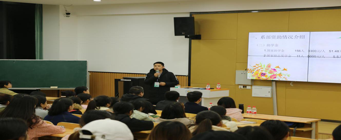 活动共计4个环节,首先由学工干事林波向参会人员通报系部今年助学情况,以及国家及学院的资助政策。