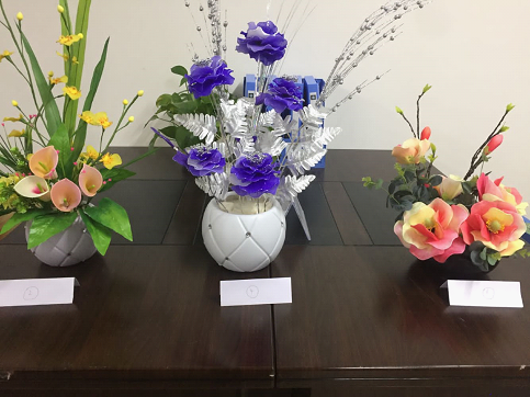 之后,于12月3日19:10二号教学楼b区307上交作品并做好登记,工作人员对其经行摆放和编号,第二天由系部老师共同评选。经老师商议得出一个一等奖,两个二等奖和三个三等奖。分别是一等奖纸艺雏菊,二等奖丝网加棉玉兰和丝网牡丹太阳花,三等奖丝网跳舞兰、纸艺桔梗花、纸艺牡丹,及优秀奖。