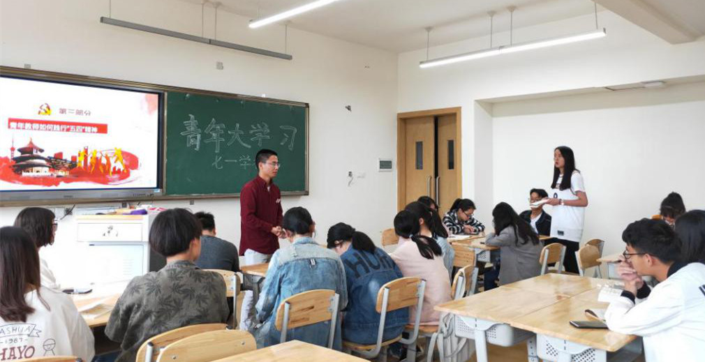 为弘扬五四精神,纪念革命先辈,增强青年的责任感、使命感,充分展示青年的时代风采。2019年5月13日12:10 七一学社在二教学楼B305开展青年大学习——弘扬五四精神,争做新时代有志青年活动。出席本次活动的有医学影像系党支部常务副书记、医学影像系副主任秦志刚,七一学社指导老师龙钊,2名学社社长,部分七一学社成员以及入党积极分子。