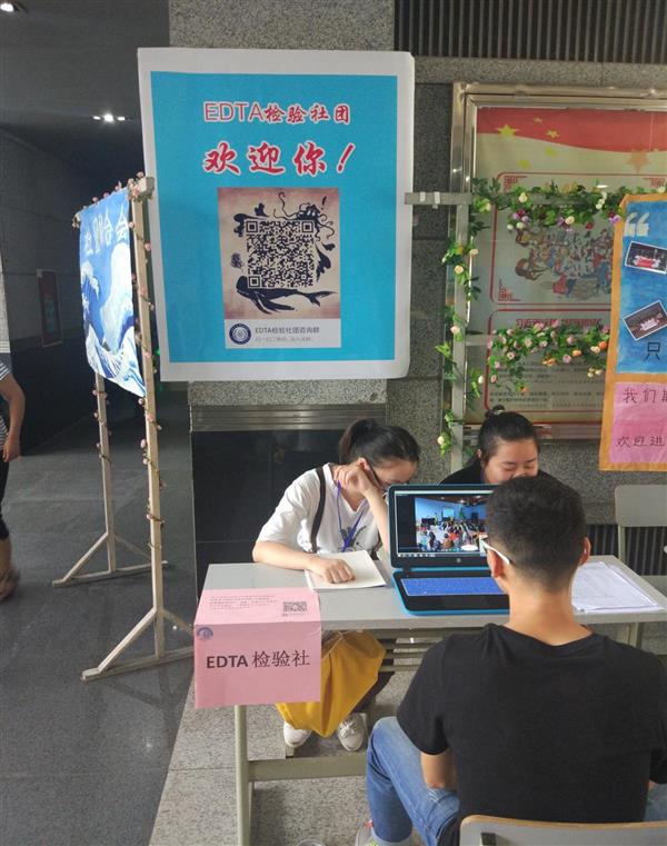 在2017年9月,在新生开学之际,社团通过在学校大厅设置社团咨询点,在网上分享EDTA检验社团招新视频,以及到班上直接进行面对面的社团辅导答疑等方式,让更多的同学更加深入和细致的了解了EDTA检验社团存在的意义。